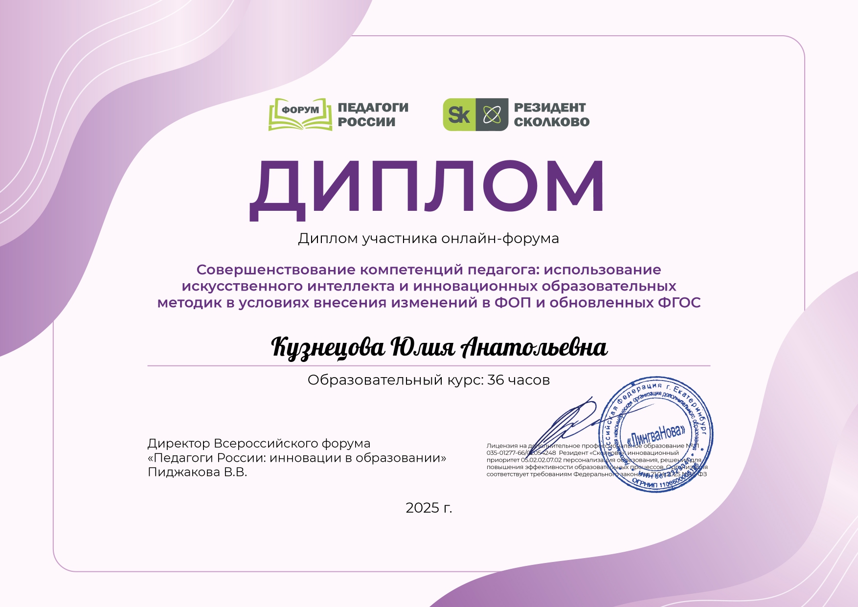 Диплом участника онлайн-форума "Совершенствование компетенции педагог: использование искусственного интеллекта и инновационных образовательных методик в условиях внесения изменений в ФОП и обновленных ФГОС"