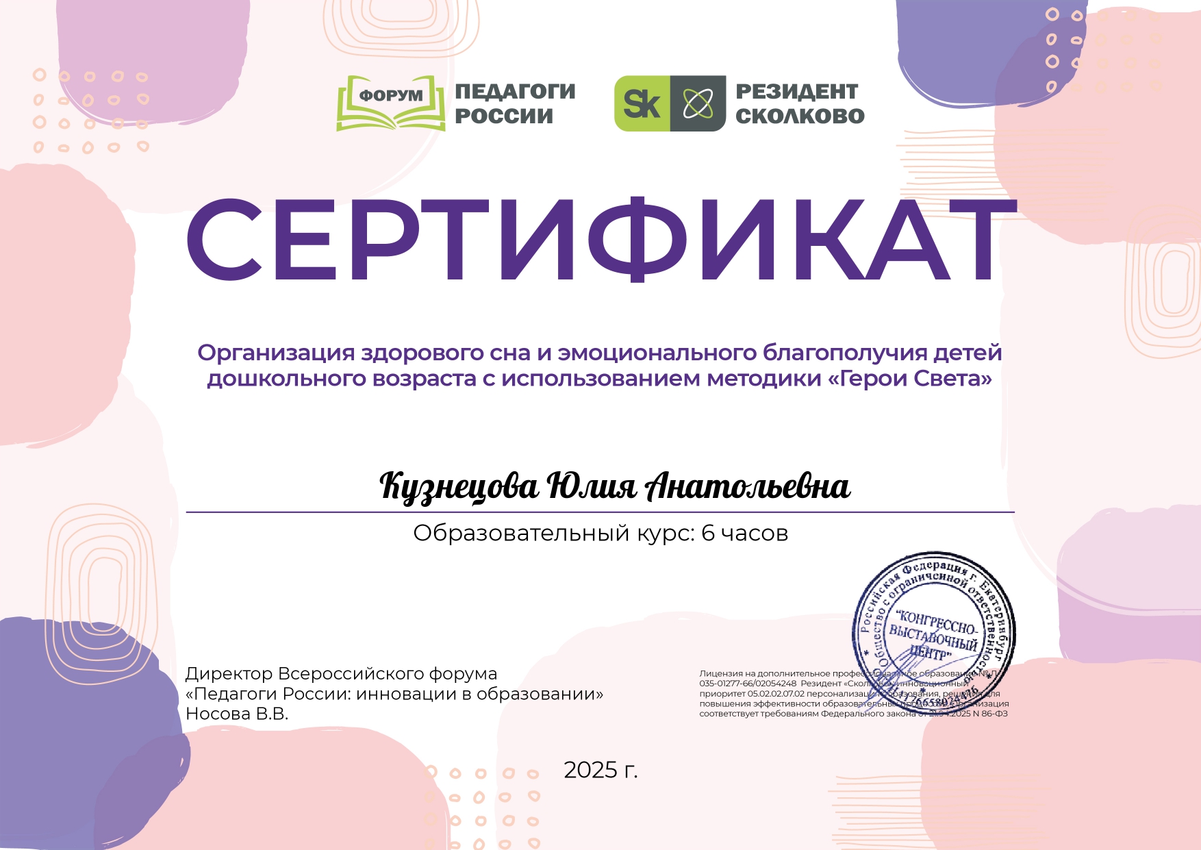 Сертификат "Организация здорового сна и эмоционального благополучия детей дошкольного возраста с использованием методики "Герои Света""