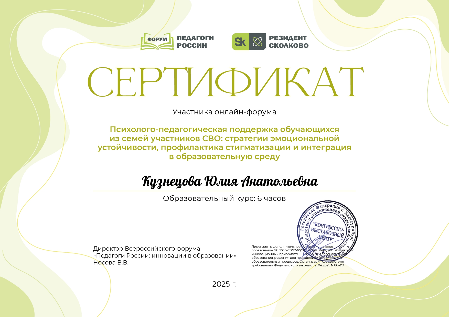 Сертификат участника онлайн-форума "Психолого-педагогическая поддержка обучающихся из семей участников СВО: стратегии эмоциональной устойчивости, профилактика стигматизации и интеграция в образовательную среду"