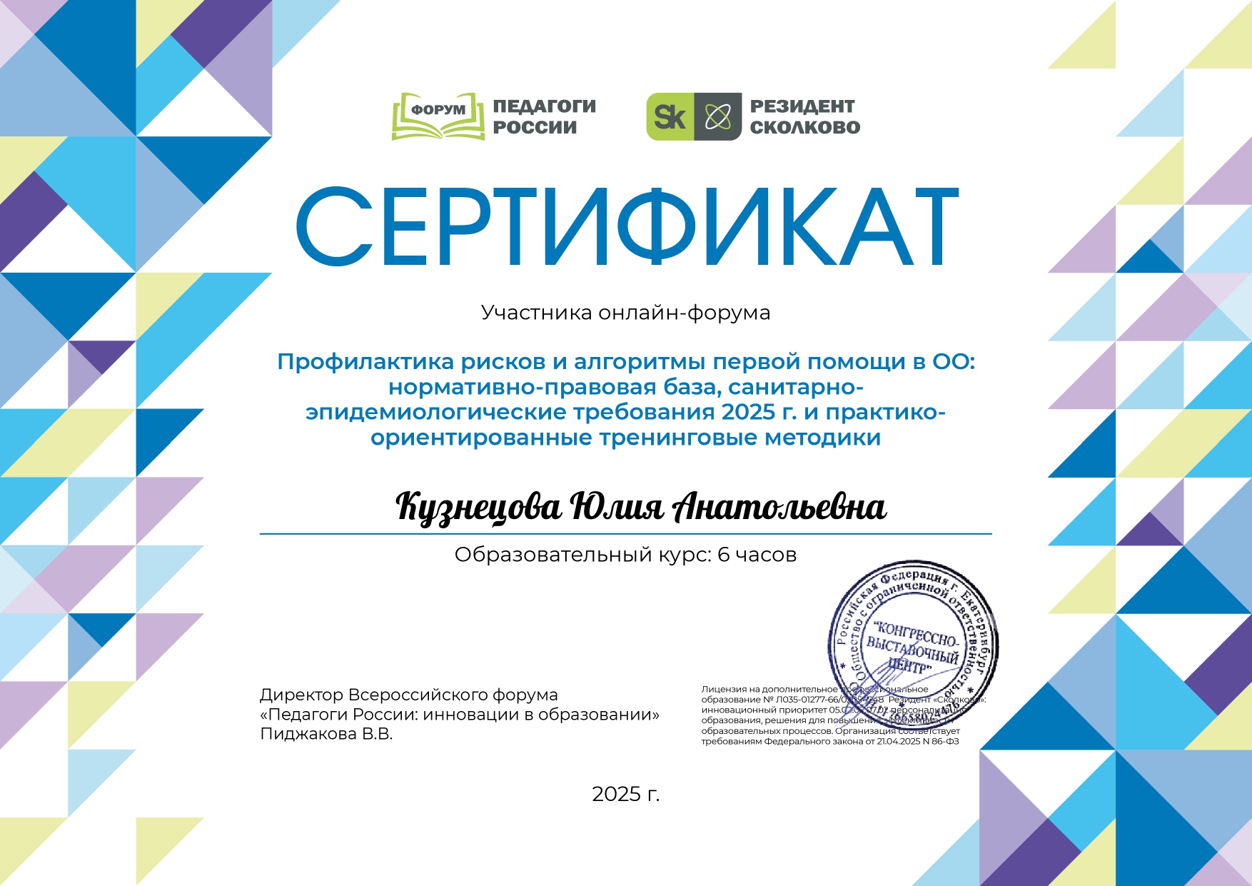 Сертификат участника онлайн-форума "Профилактика рисков и алгоритмы первой помощи в ОО: нормативно-правовая база, санитарно-эпидемиологические требования 2025г. и практико-ориентированные тренинговые методики"