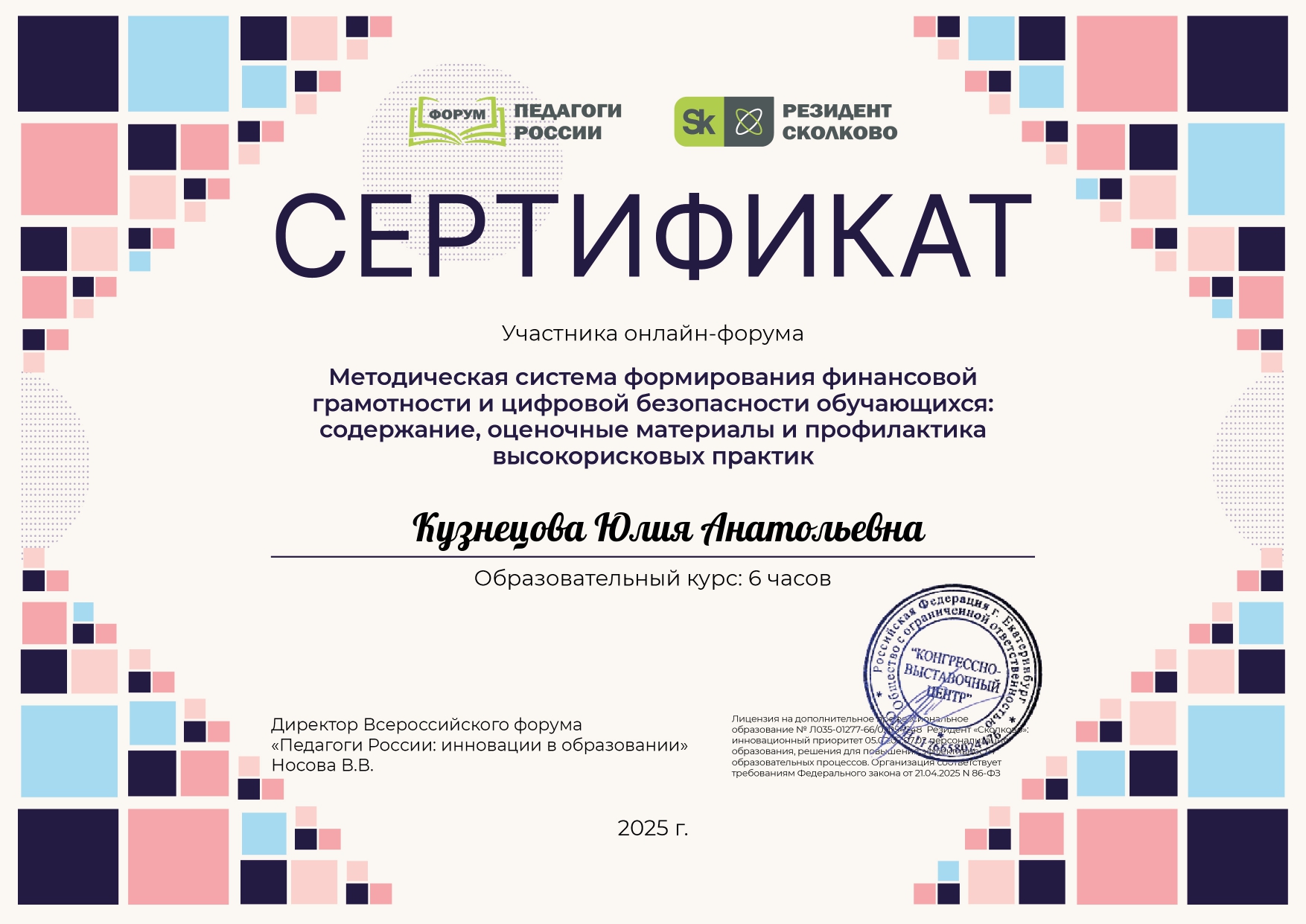 Сертификат участника онлайн-форума "Методическая система формирования финансовой грамотности и цифровой безопасности обучающихся: содержание, оценочные материалы и профилактика" высокорисковых практик