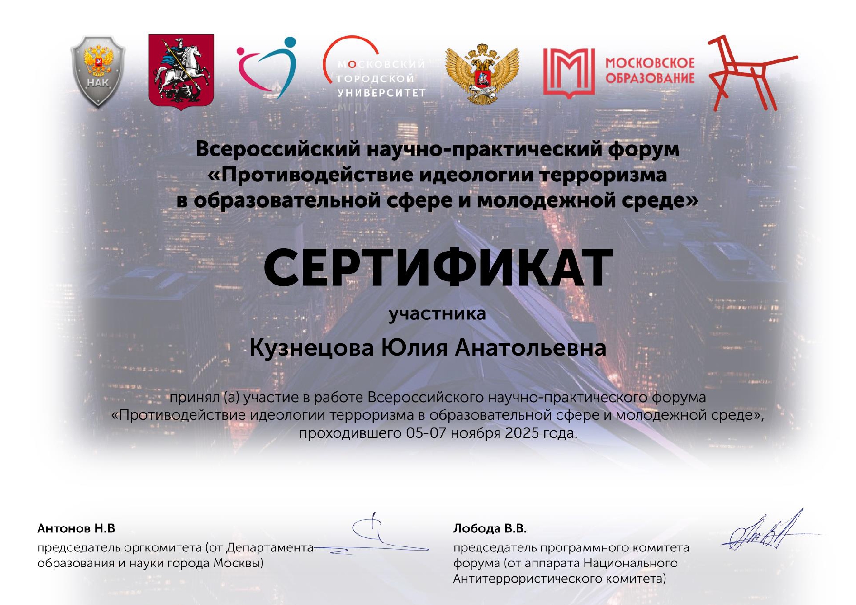 Сертификат в работе Всероссийского научно-практического форума "Противодействие идеологии терроризма в образовательной сфере и молодежной среде".