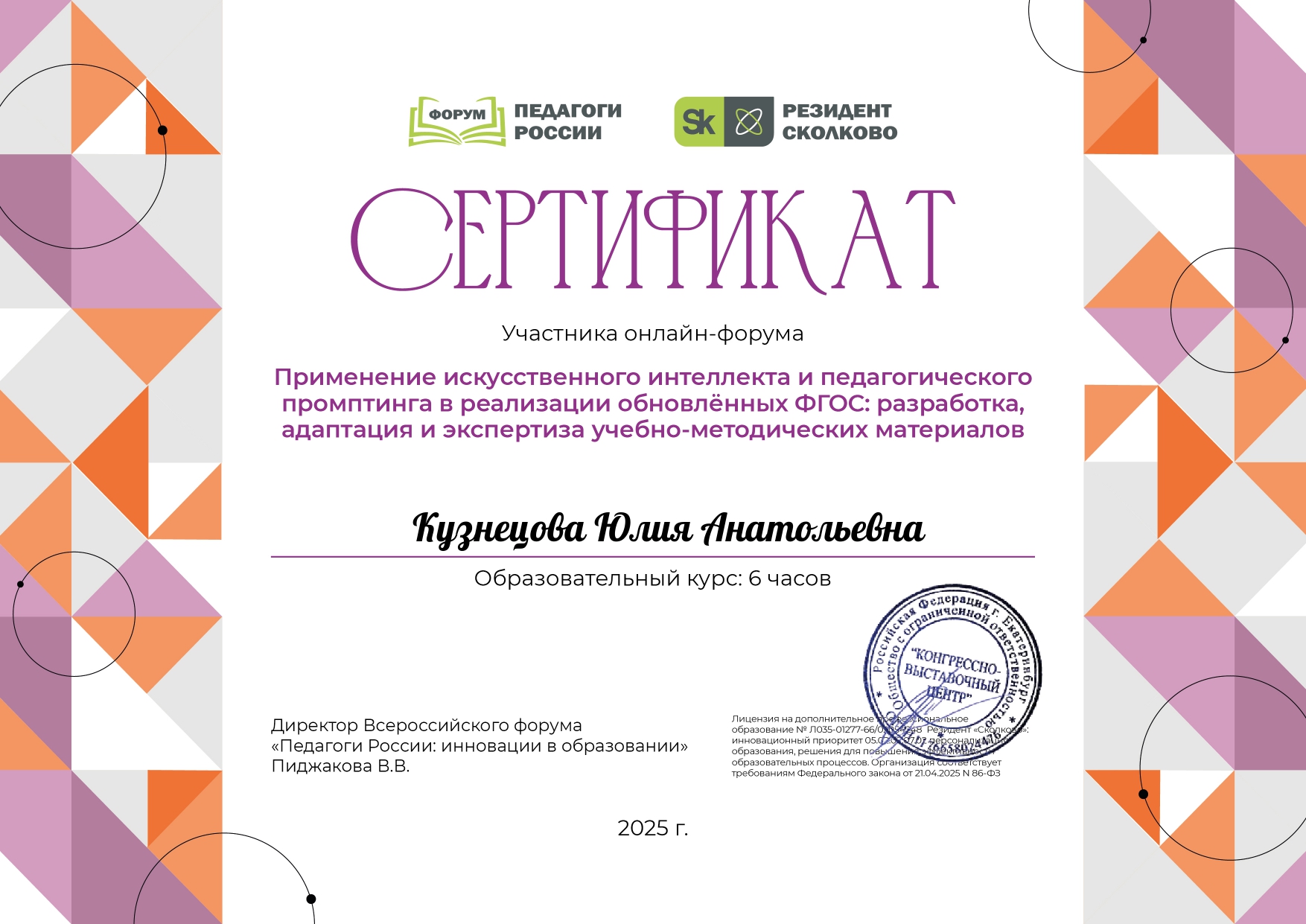 Сертификат участника онлайн-форума "Применение искусственного интеллекта и педагогического промптинга в реализации обновлённых ФГОС: разработка, адаптация и экспертиза учебно-методических материалов"